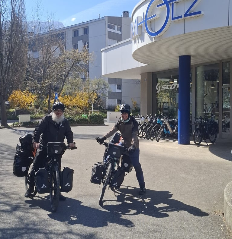 Bevor wir losfuhren, machten wir noch einen letzten Halt beim Velo Center Imholz in Chur – unserer Werkstatt, der wir von Herzen danken möchten. Für die super Arbeit an unseren Rädern und für das gesponserte Licht, das bereits seinen ersten Einsatz hatte und perfekt funktioniert. Sehr empfehlenswert – wer in der Region ein verlässliches Velofachgeschäft sucht, ist dort in den besten Händen.